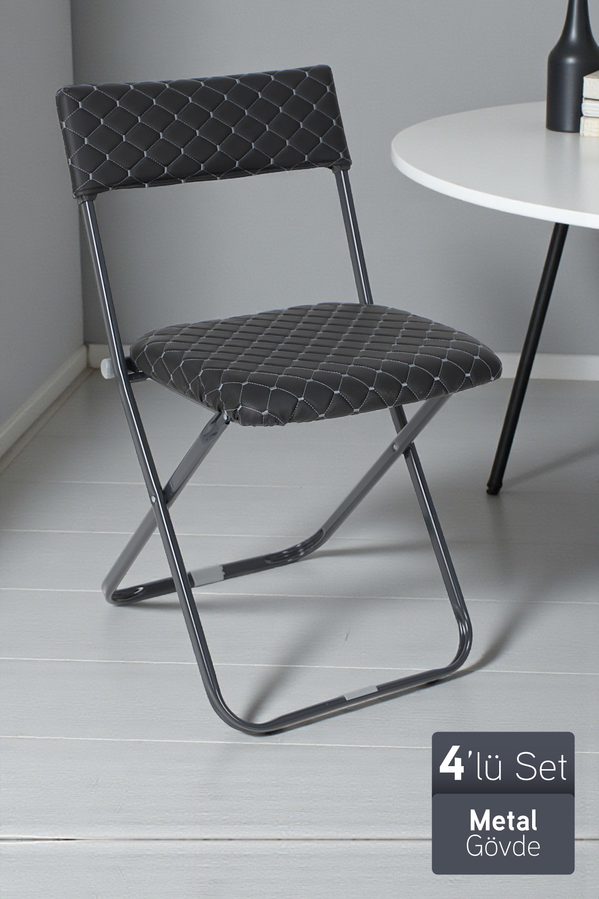İronika Anatolia Metal Gövdeli Deri Kapitone Sandalye Katlanır Mutfak Bahçe Sandalyesi 4 Adet Siyah