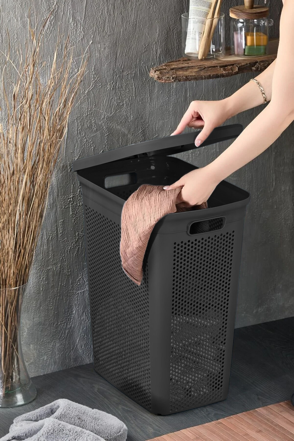 İronika Slim Kapaklı Dekoratif Kirli Çamaşır Sepeti 45 Litre - Siyah
