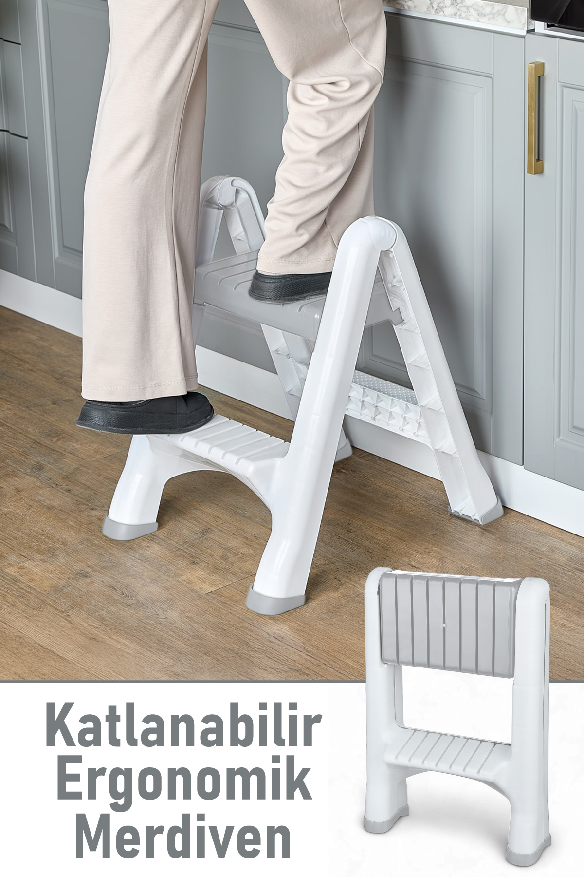 İronika 2 Basamaklı Merdiven Plastik Hafif Mutfak Tezgah Perde Merdiveni - Beyaz