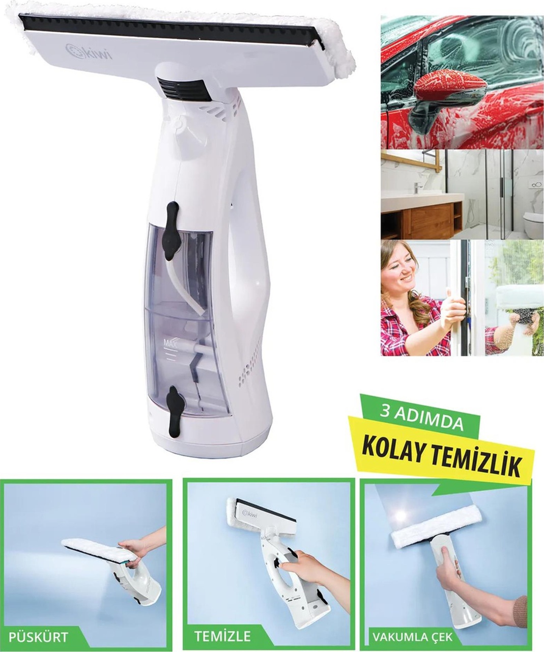 Geniş kullanım alanı. ; Ev, yemek masası, mutfak, banyo,seramik, mermer yüzeyler, pencereler, camlar ve aynalarda iz bırakmadan kolayve hızlı temizlik. ; Arabadaki dökülen sıvının vakumlanması. ; Dahili su püskürtmefonksiyonu. ; Temizlik paspası. ; İki sıvı tankı (sprey ve vakum) ile depolama.Vakum 0,7 kPa. ; Şarj süresi 2 saattir. ; Çalışma süresi 35 dakika. ; 65 dBA ilesessiz çalışma. ; Vakum başlığı uzunluğu: 25,5 cm. ; Su kapasitesi 100ml. ; Kirli sukapasitesi: 86ml. ; Şarj edilebilir 3,7 V Li-ion pil, 2000 mAh. ; Nominal güç: 10Watt. ; Aksesuarlar: USB Type-C kablo, mikrofiber silme bezi, doldurma kabı.;